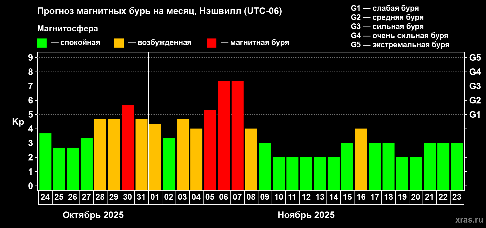 Прогноз магнитных бурь в Нэшвилле — 24 октября 2025 года