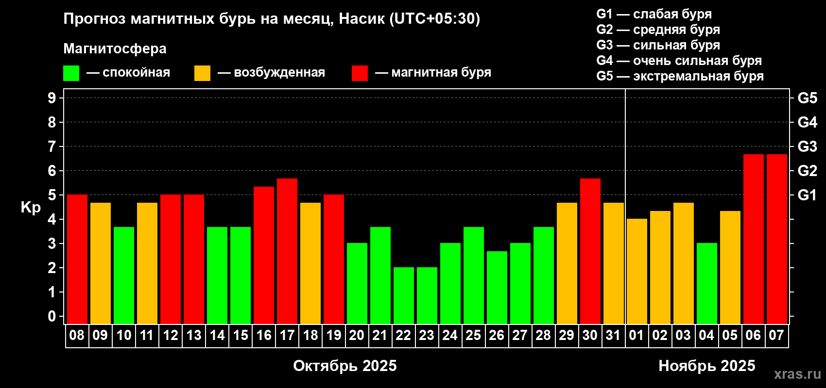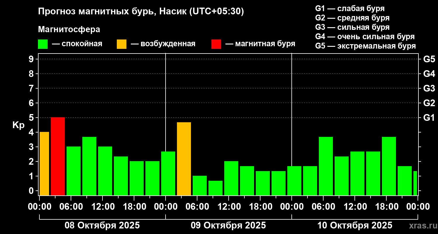 Прогноз магнитных бурь в Насике — 8 октября 2025 года