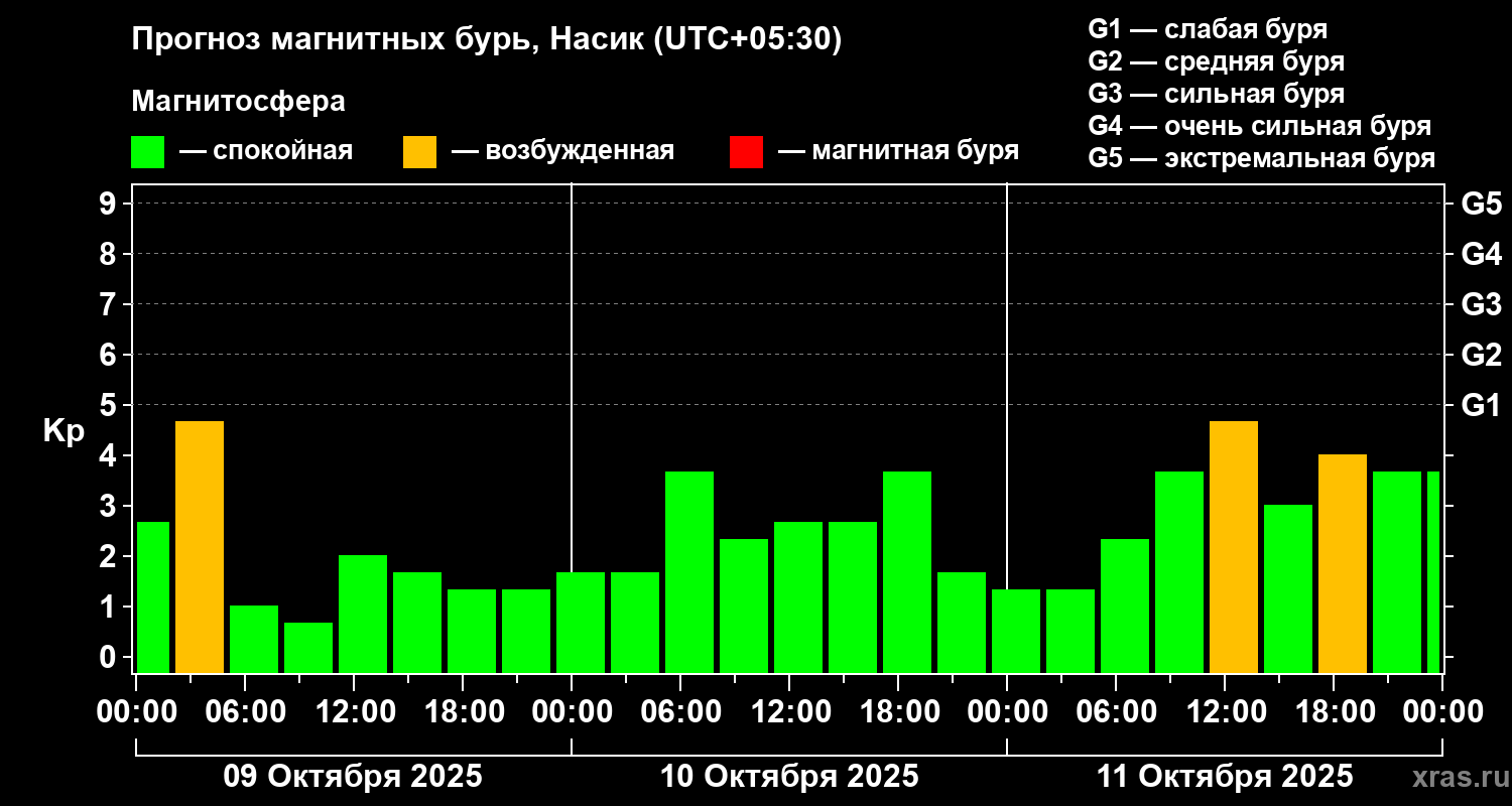 Прогноз магнитных бурь в Насике — 9 октября 2025 года