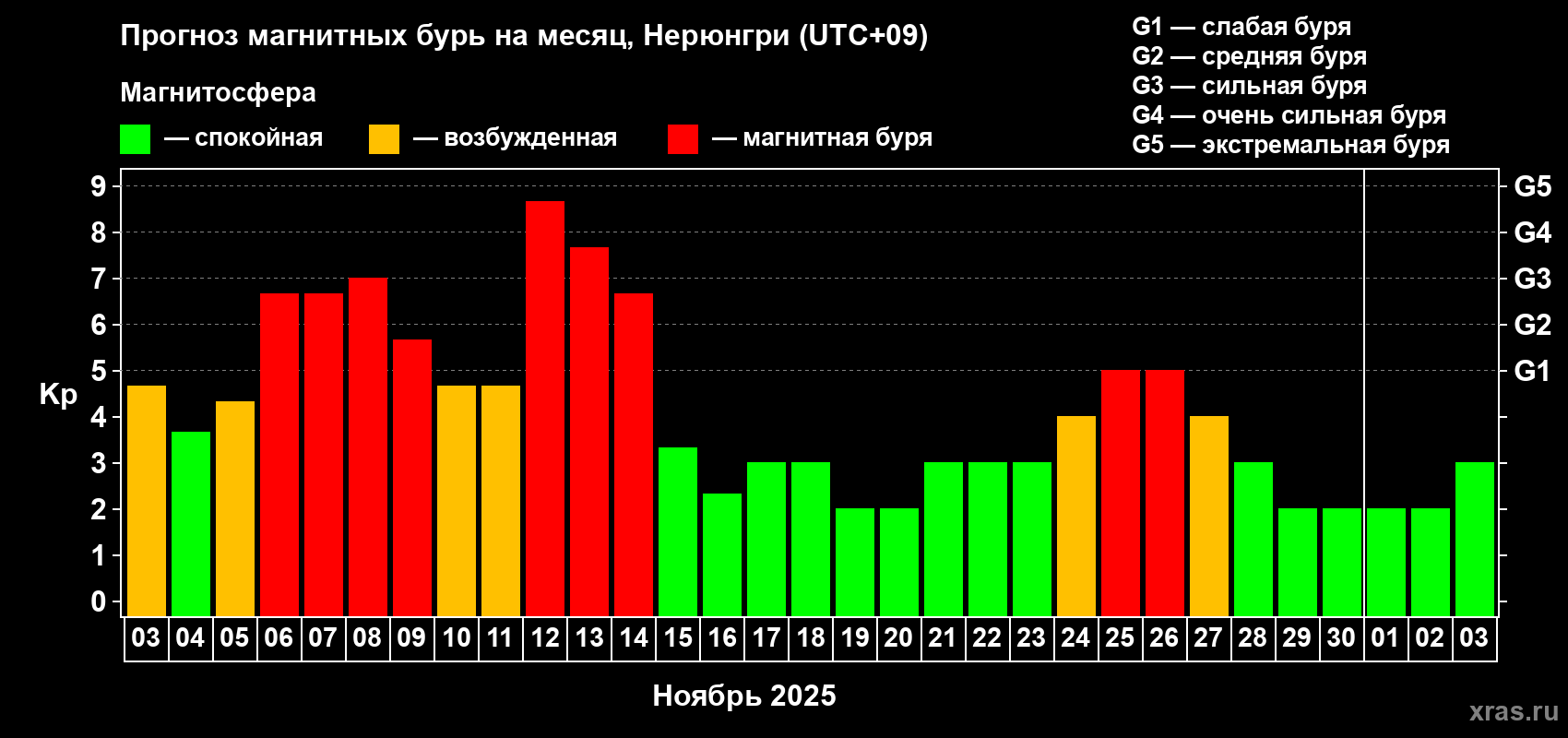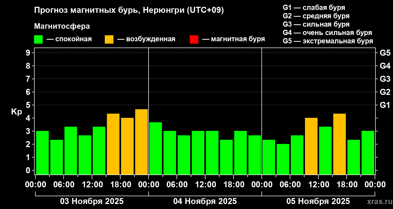 Прогноз магнитных бурь Нерюнгри — 3 ноября 2025 года