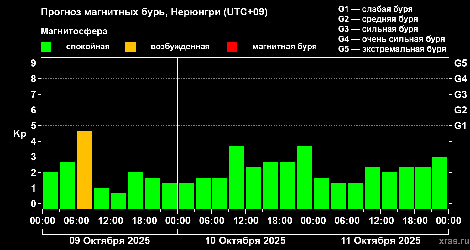 Прогноз магнитных бурь Нерюнгри — 9 октября 2025 года