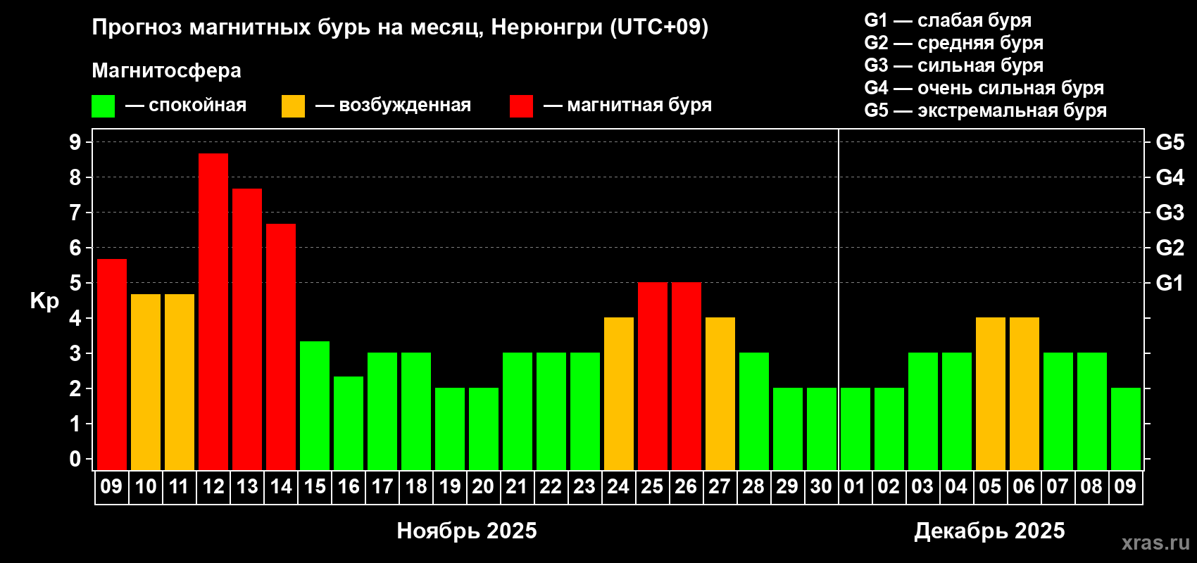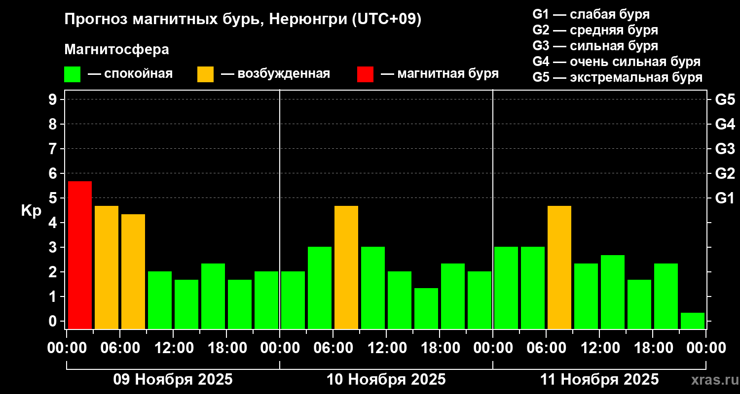 Прогноз магнитных бурь Нерюнгри на 9 ноября 2025 года