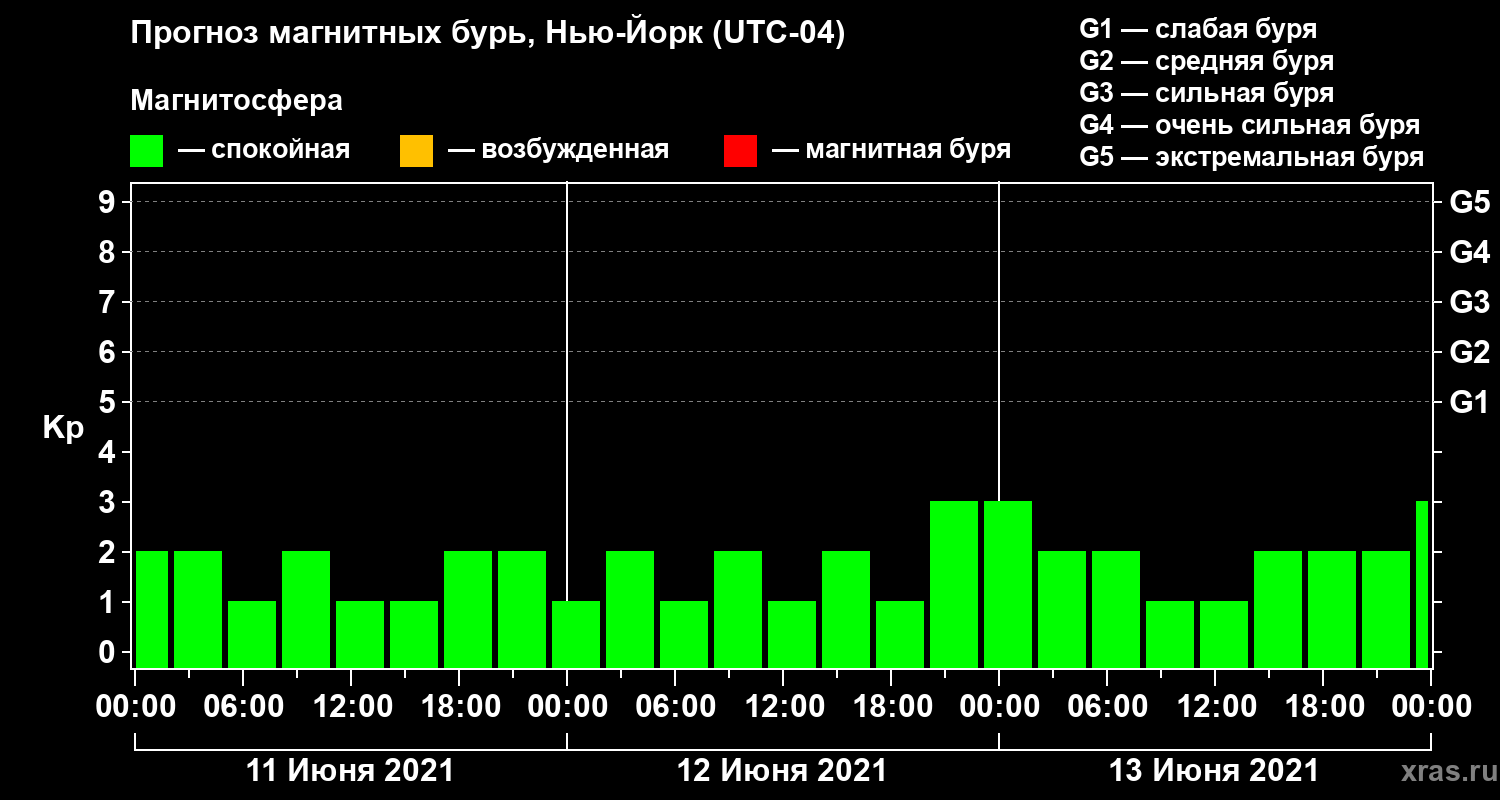 Прогноз магнитных бурь в Нью-Йорке на 11 июня 2021 года