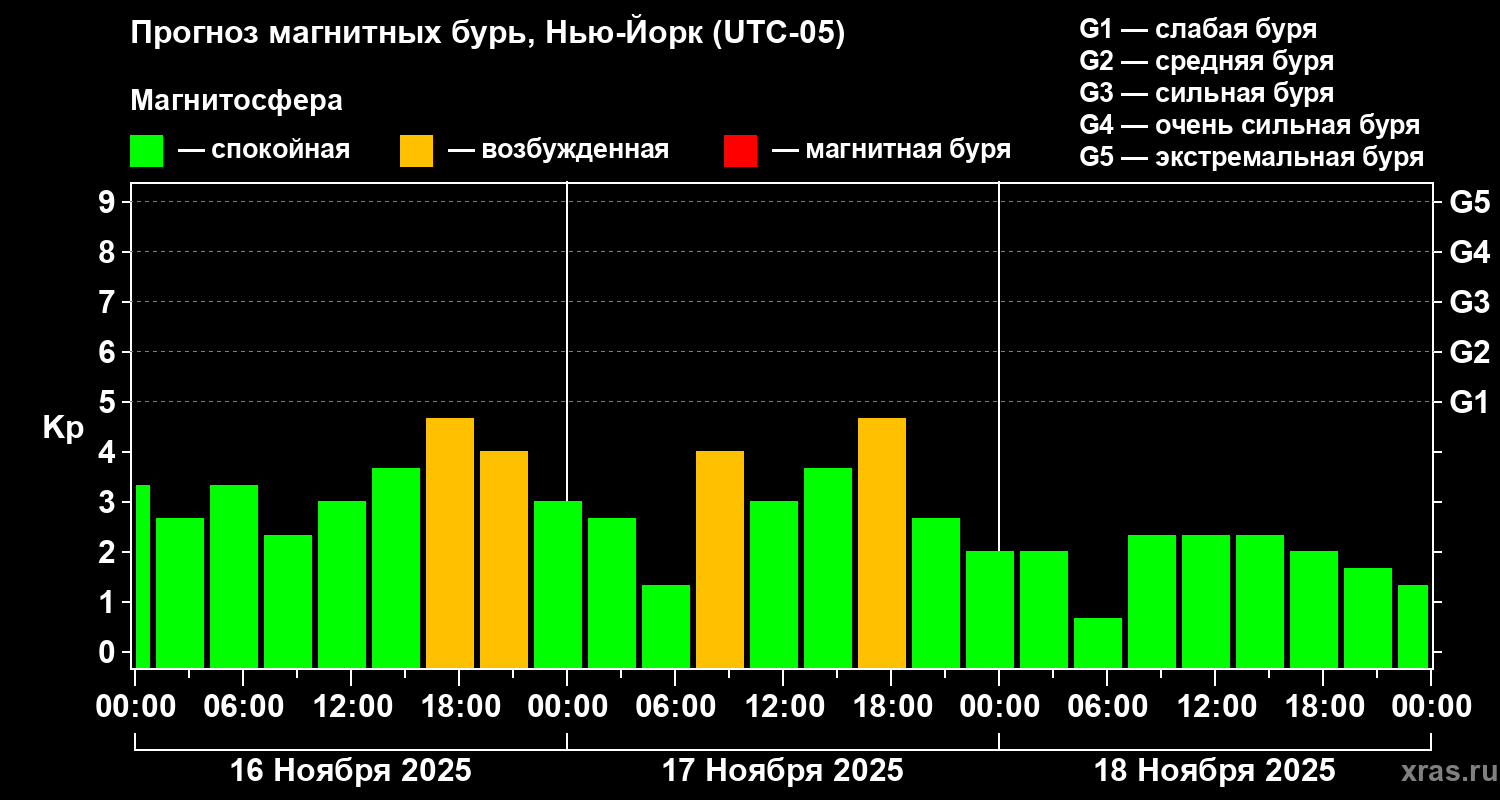 Прогноз магнитных бурь в Нью-Йорке на 16 ноября 2025 года