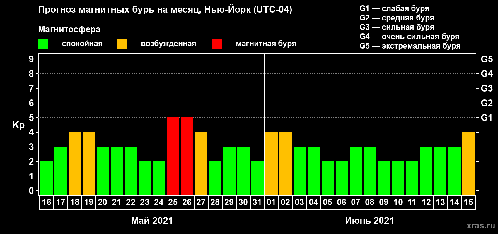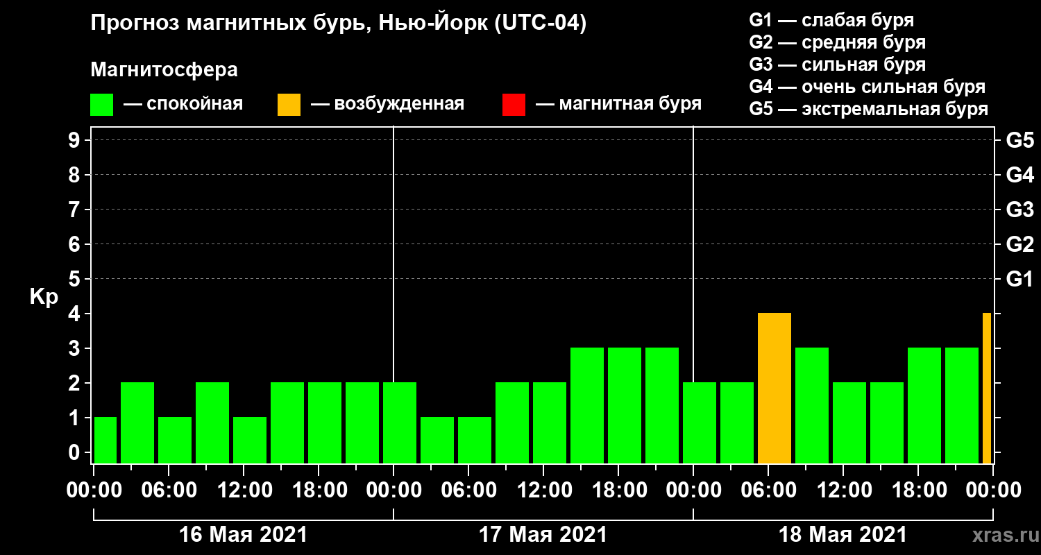 Прогноз магнитных бурь в Нью-Йорке — 16 мая 2021 года