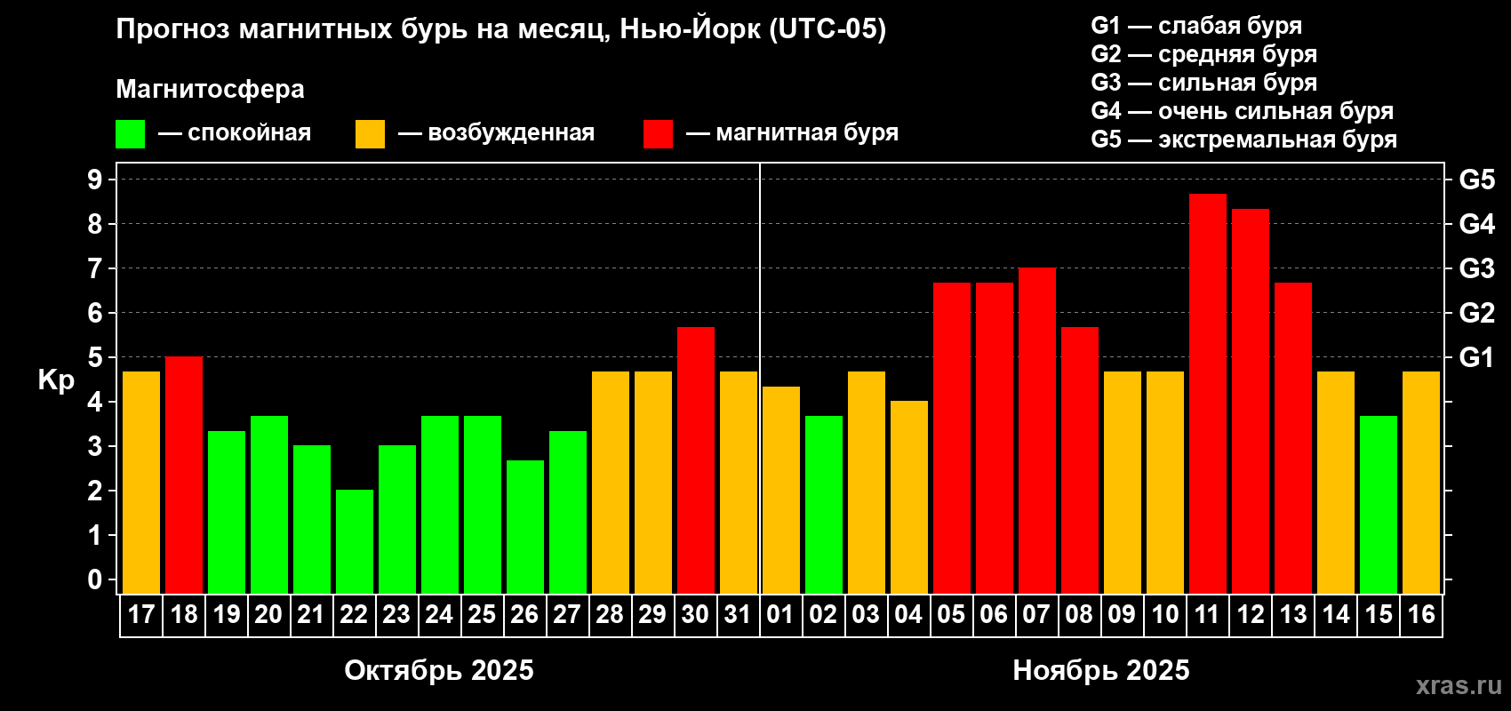Прогноз магнитных бурь в Нью-Йорке — 17 октября 2025 года