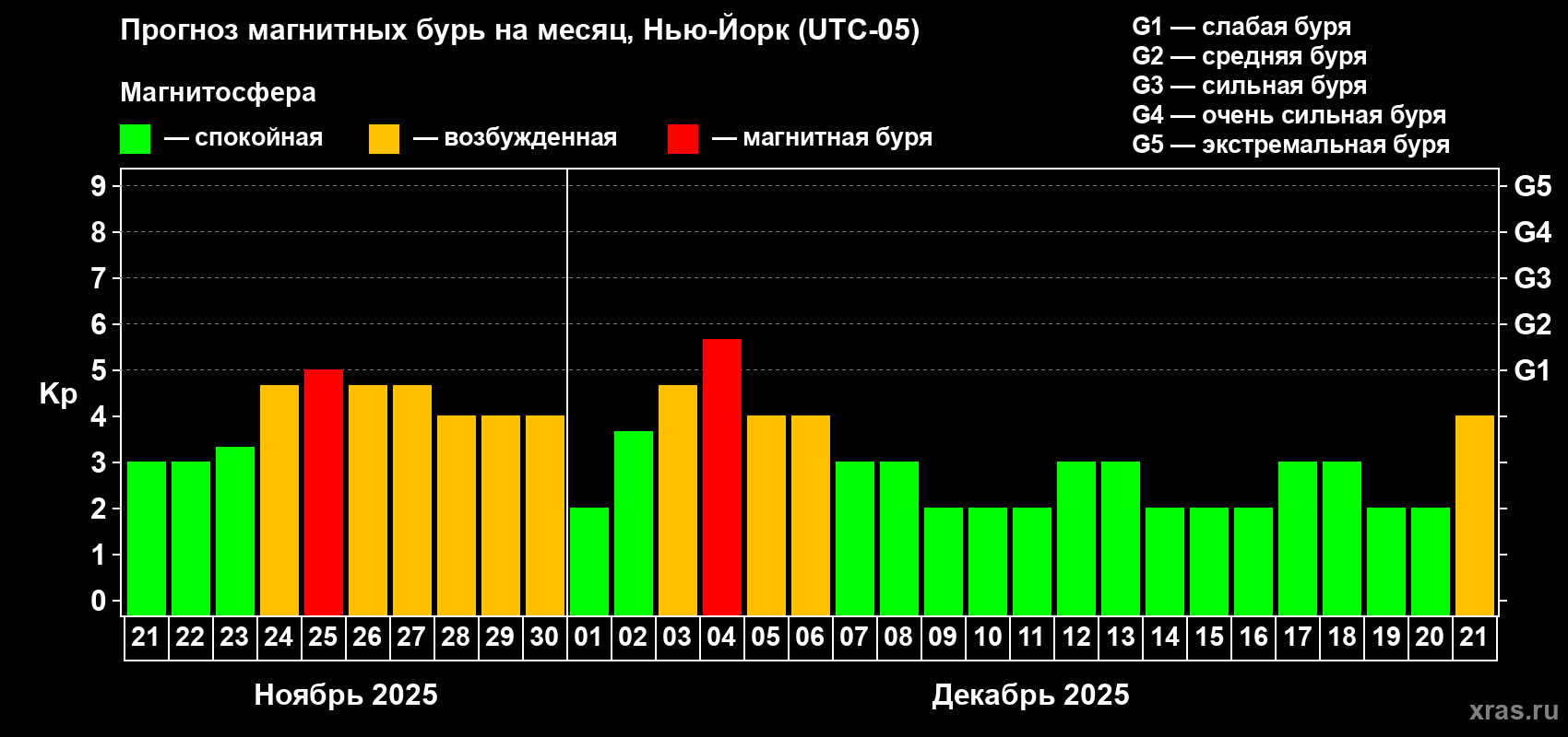 Прогноз магнитных бурь в Нью-Йорке на 21 ноября 2025 года