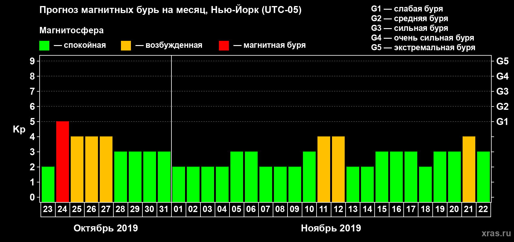 Прогноз магнитных бурь в Нью-Йорке — 23 октября 2019 года