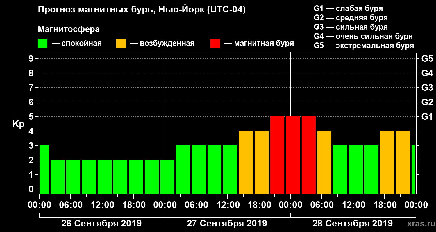 Прогноз магнитных бурь в Нью-Йорке на 26 сентября 2019 года