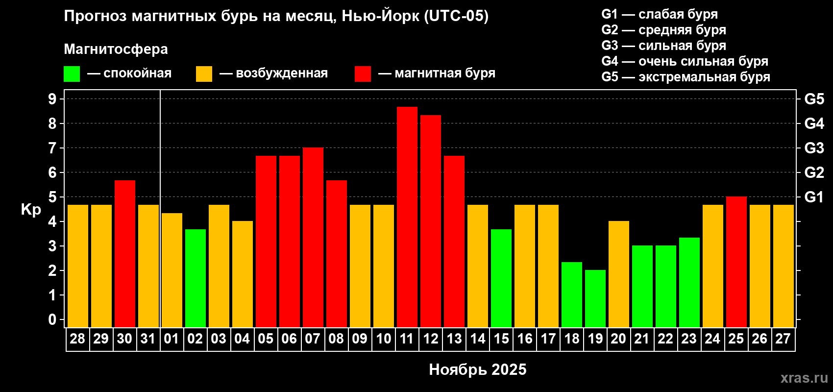 Прогноз магнитных бурь в Нью-Йорке на 28 октября 2025 года