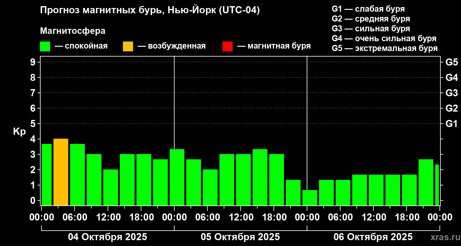 Прогноз магнитных бурь в Нью-Йорке — 4 октября 2025 года