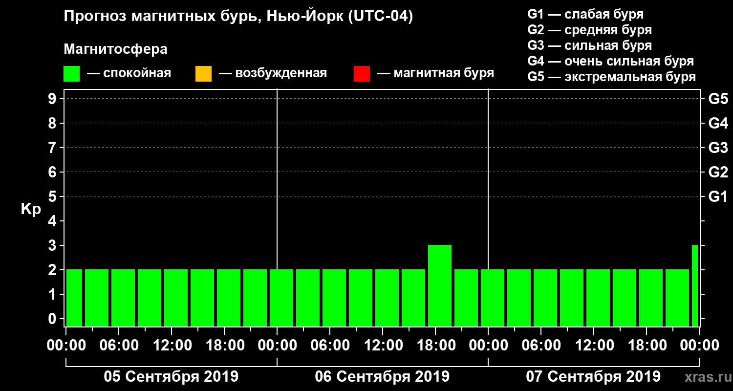 Прогноз магнитных бурь в Нью-Йорке на 5 сентября 2019 года