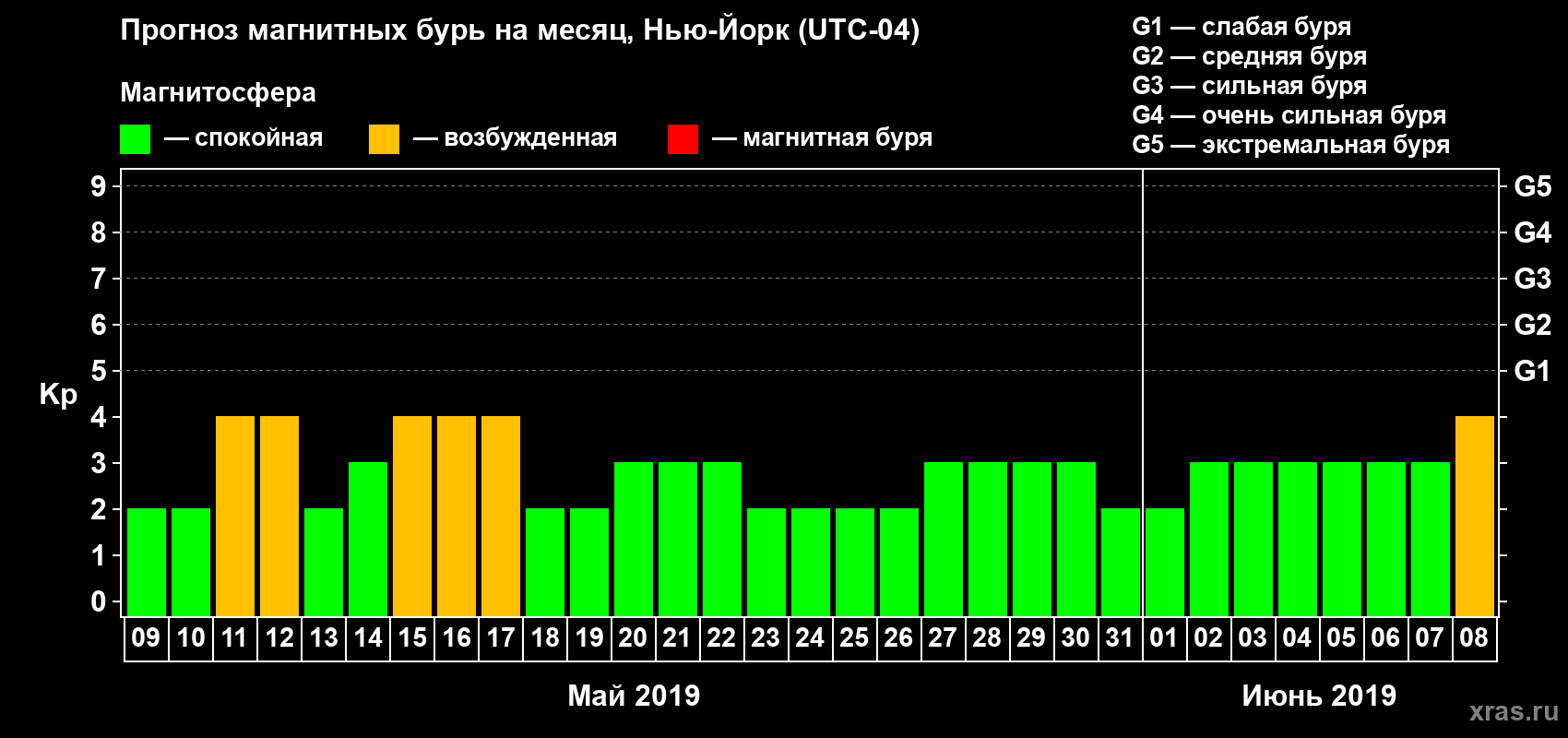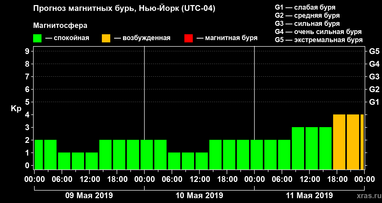 Прогноз магнитных бурь в Нью-Йорке — 9 мая 2019 года