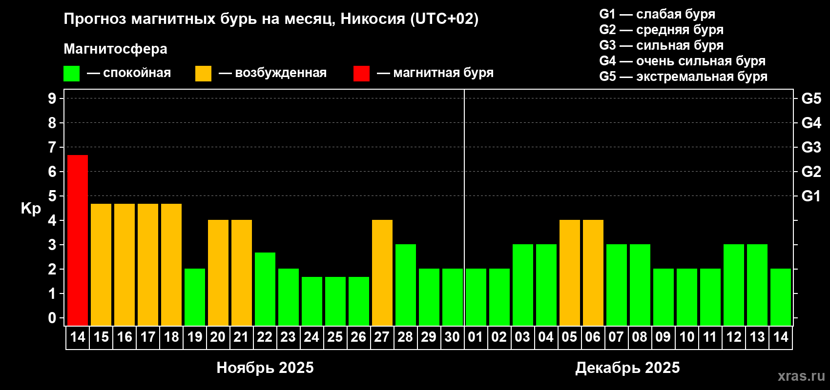 Прогноз магнитных бурь в Никосии — 14 ноября 2025 года