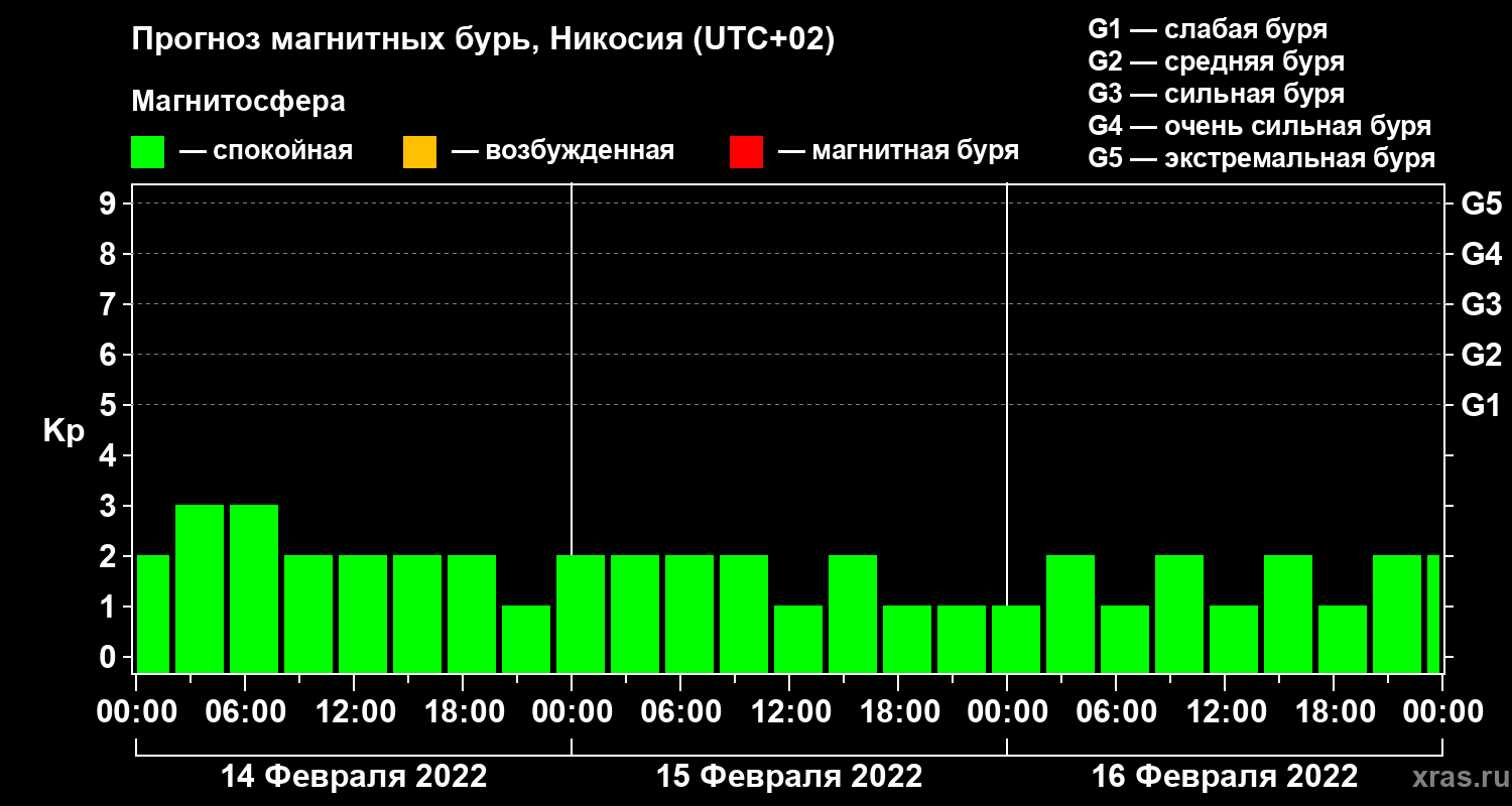Прогноз магнитных бурь в Никосии — 14 февраля 2022 года