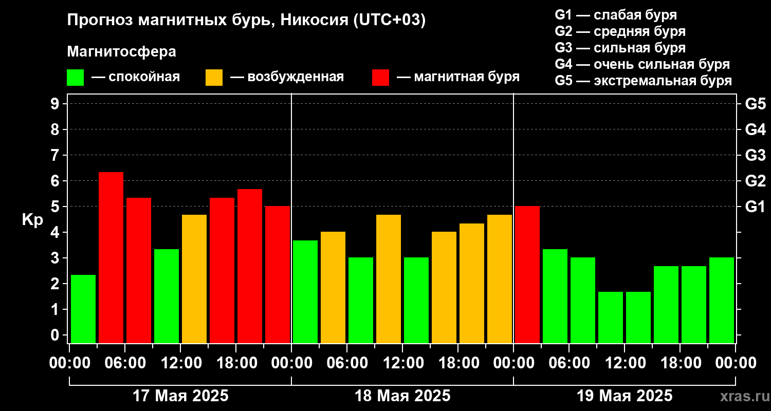 Прогноз магнитных бурь в Никосии — 17 мая 2025 года