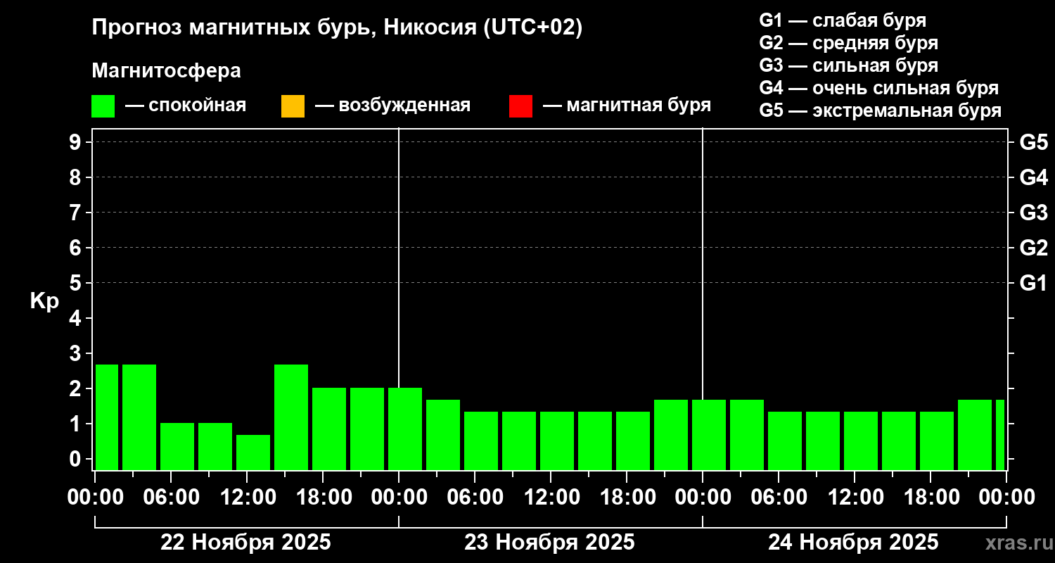 Прогноз магнитных бурь в Никосии — 22 ноября 2025 года