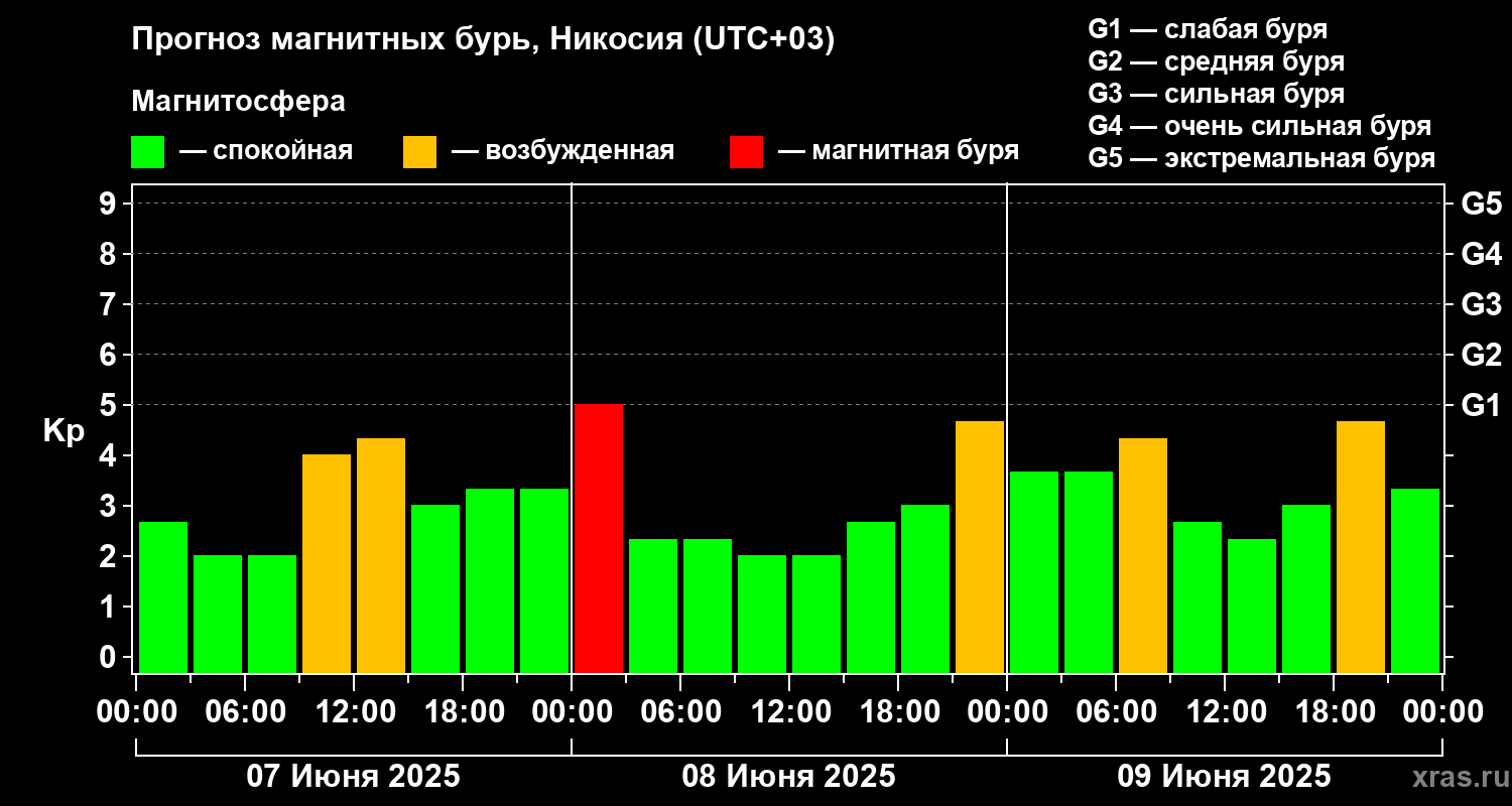 Прогноз магнитных бурь в Никосии — 7 июня 2025 года