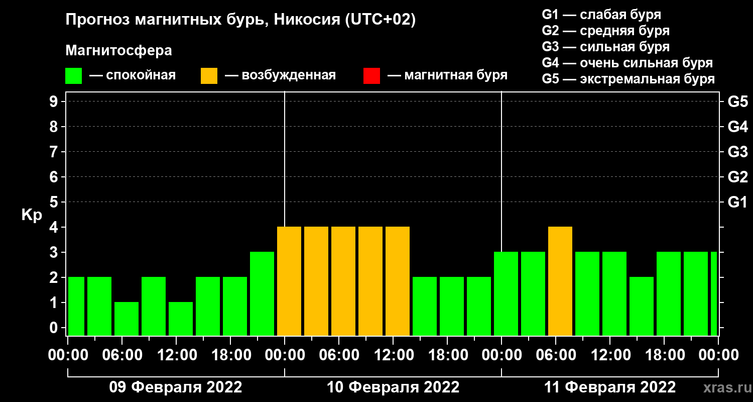 Прогноз магнитных бурь в Никосии — 9 февраля 2022 года