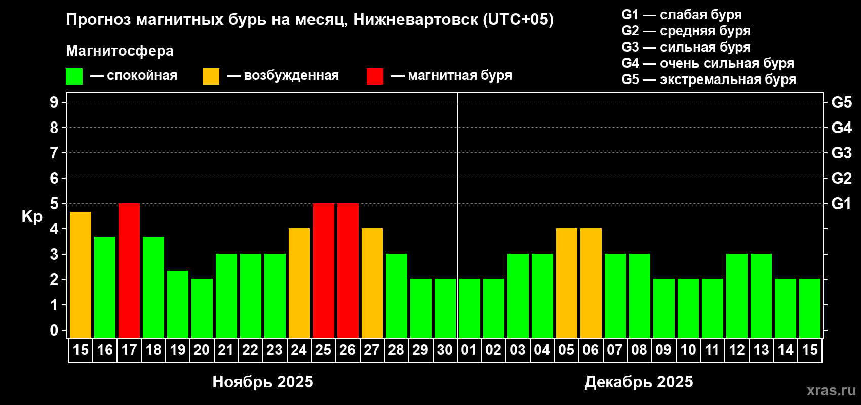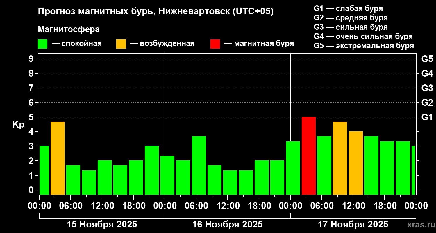 Прогноз магнитных бурь в Нижневартовске — 15 ноября 2025 года
