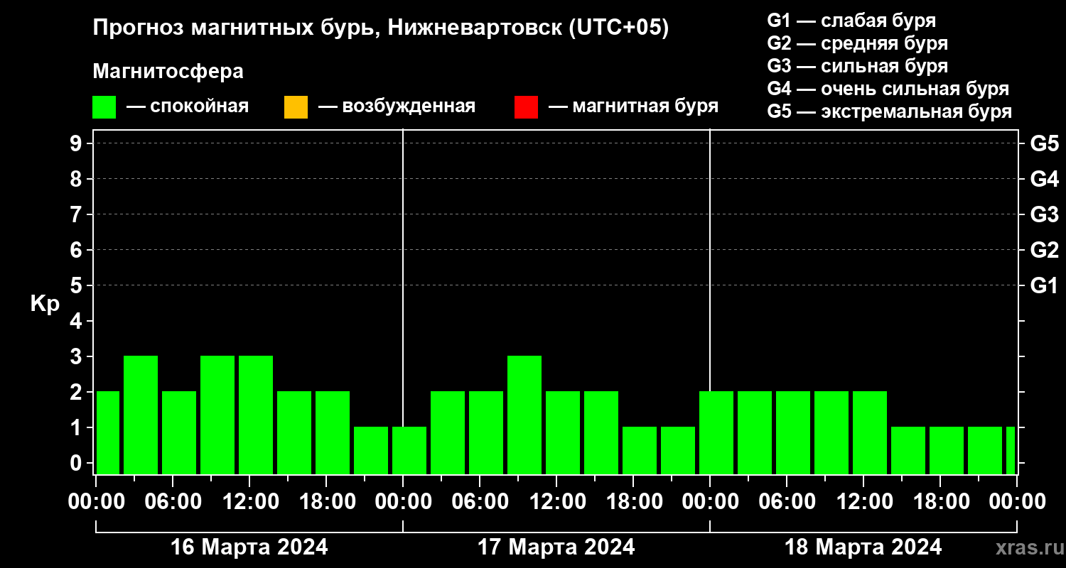Прогноз магнитных бурь в Нижневартовске на 16 марта 2024 года