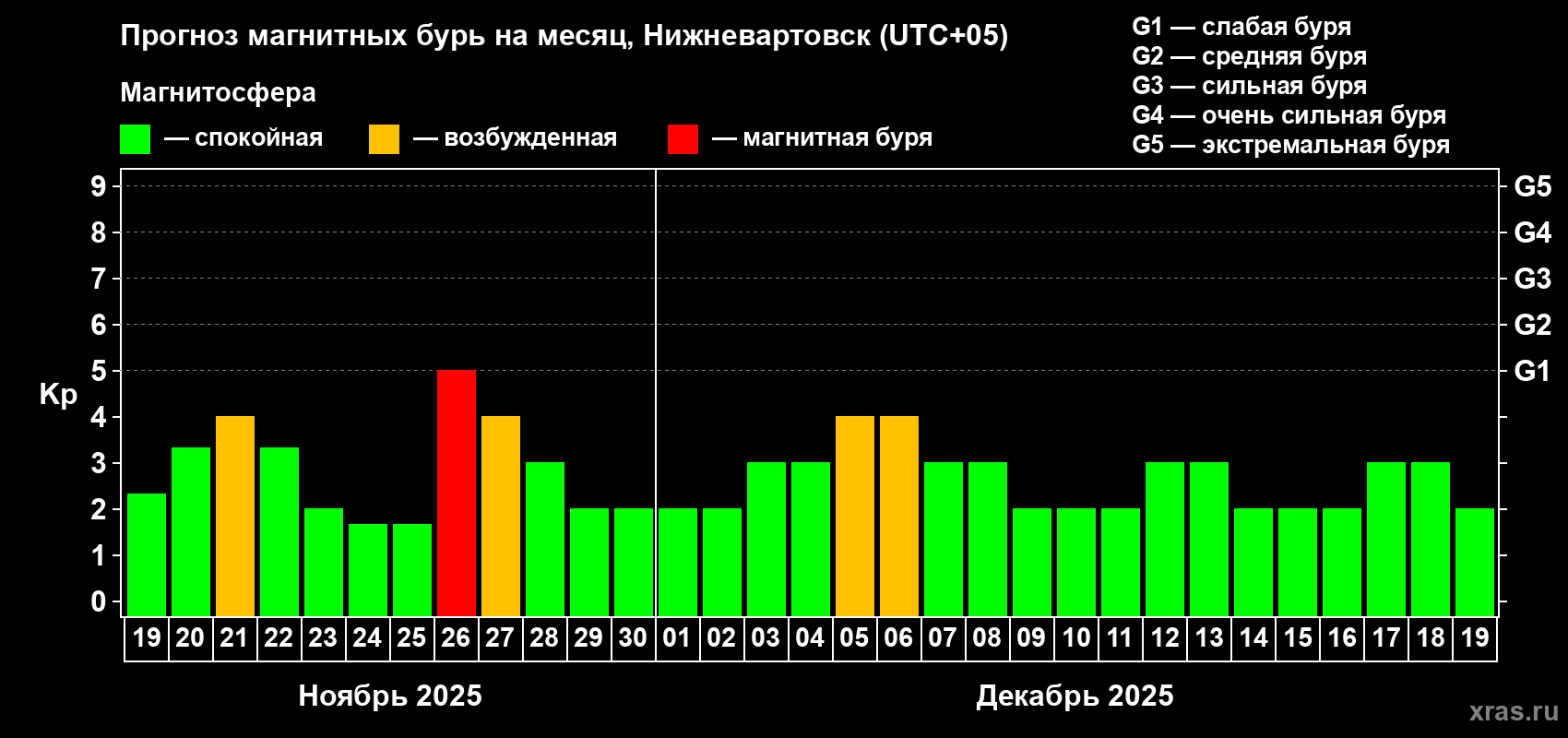 Прогноз магнитных бурь в Нижневартовске — 19 ноября 2025 года