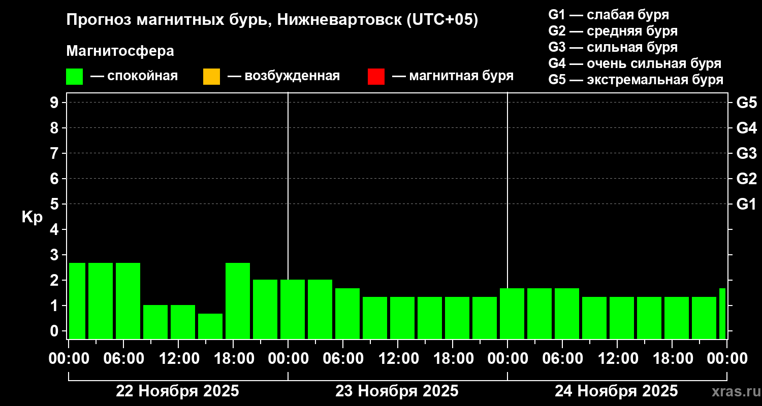 Прогноз магнитных бурь в Нижневартовске — 22 ноября 2025 года