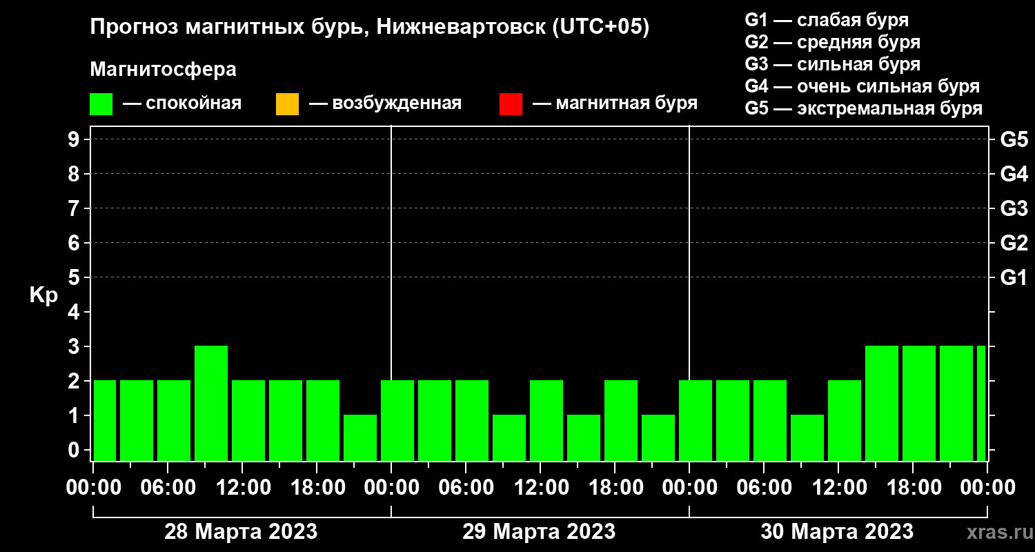 Прогноз магнитных бурь в Нижневартовске на 28 марта 2023 года