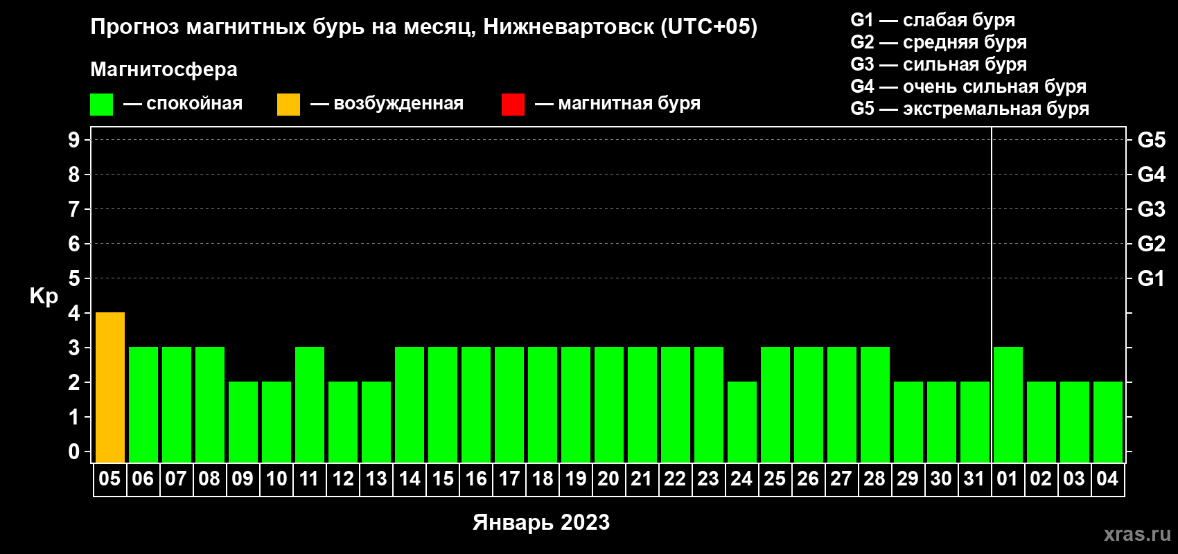 Прогноз магнитных бурь в Нижневартовске на 5 января 2023 года
