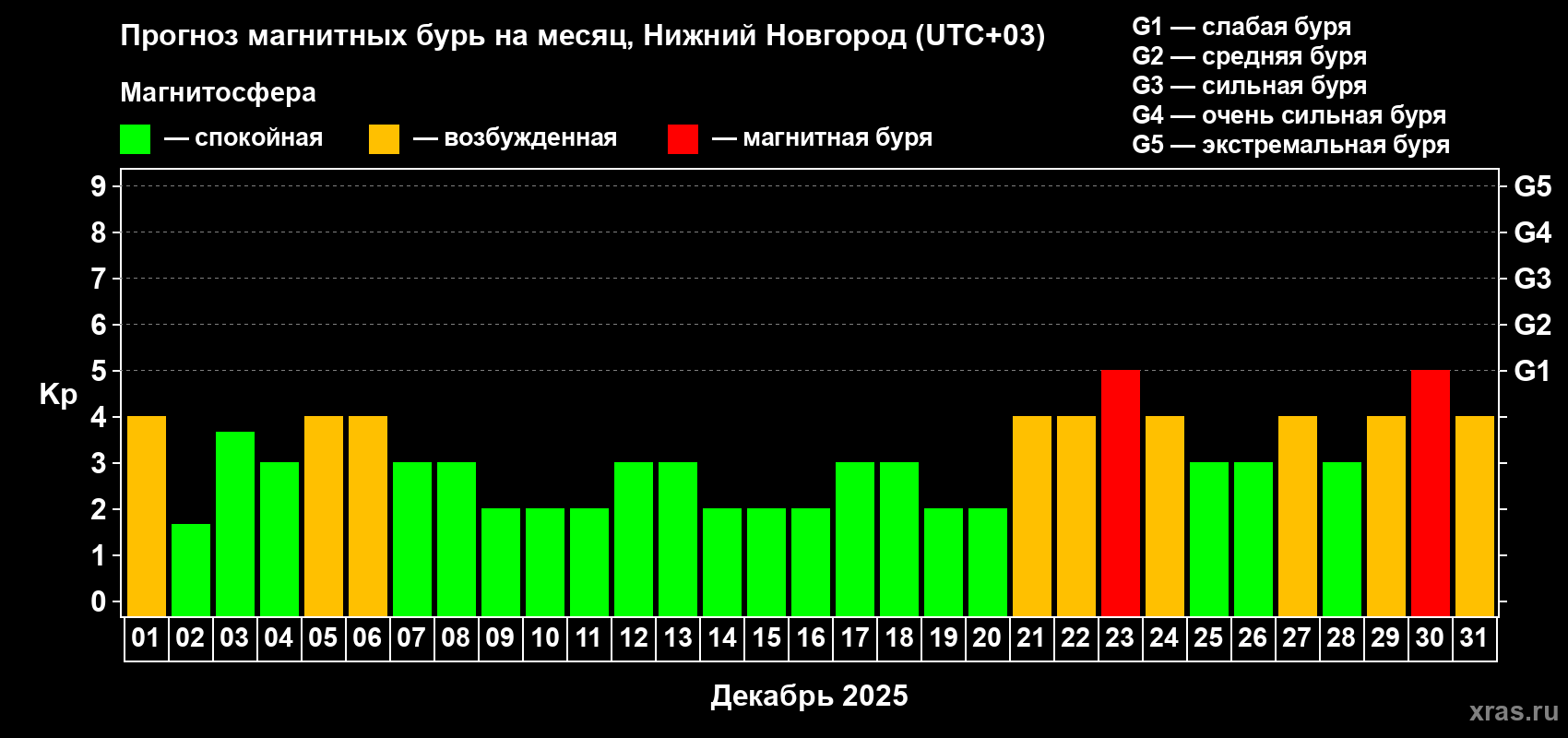 Прогноз магнитных бурь Нижнем Новгороде на 1 декабря 2025 года