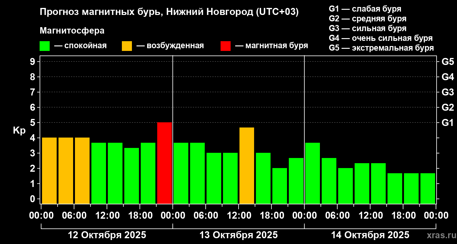 Прогноз магнитных бурь Нижнем Новгороде на 12 октября 2025 года