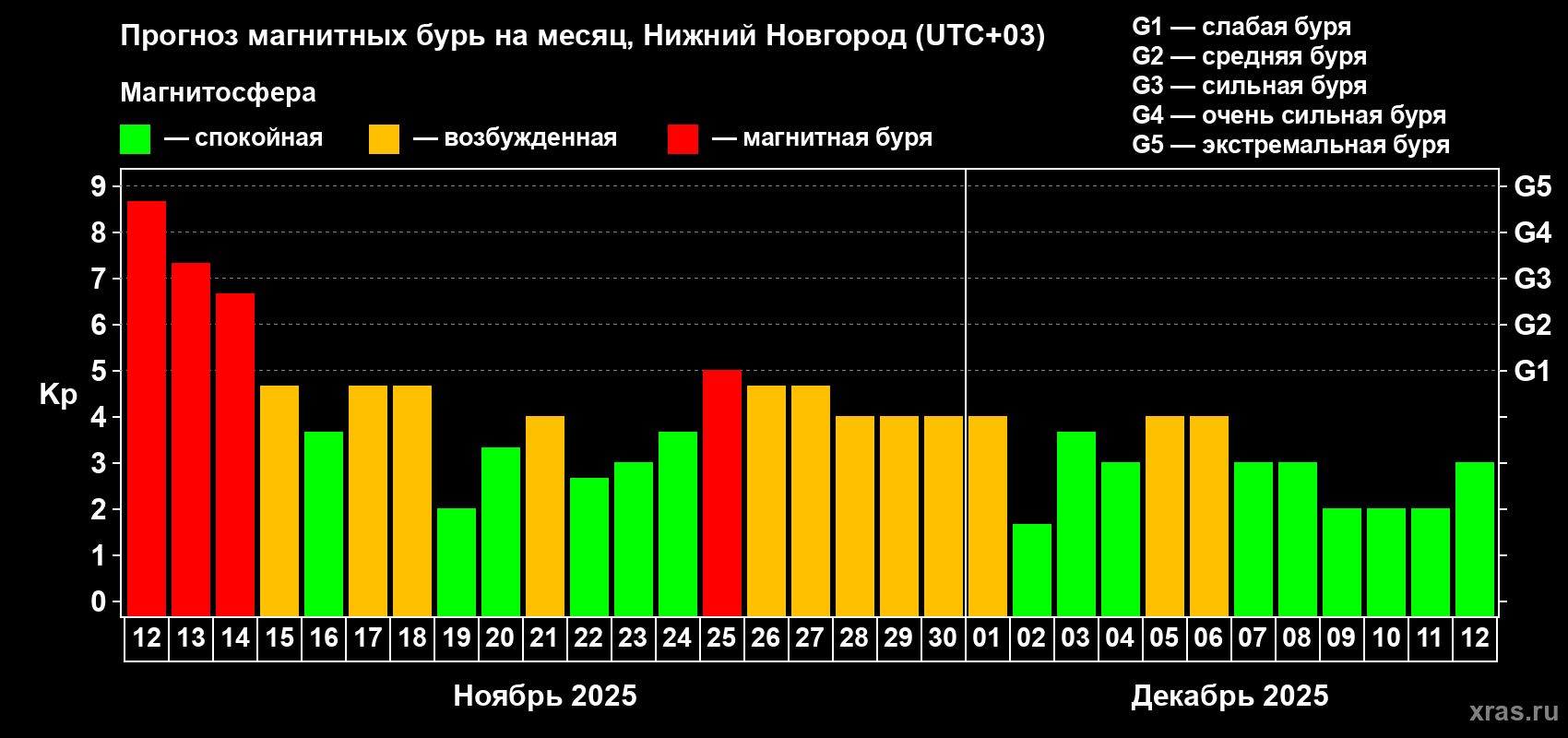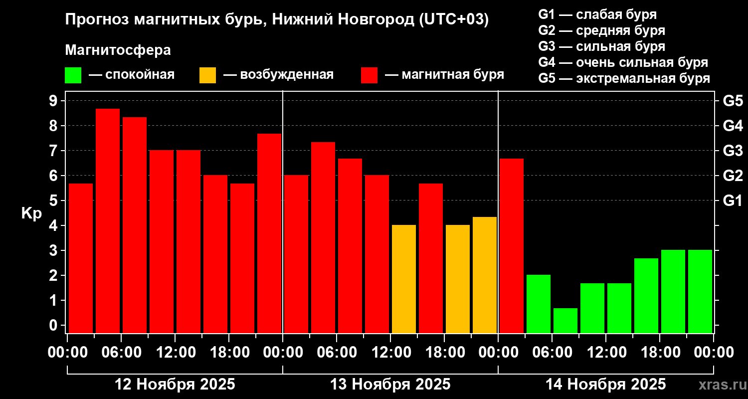 Прогноз магнитных бурь Нижнем Новгороде — 12 ноября 2025 года