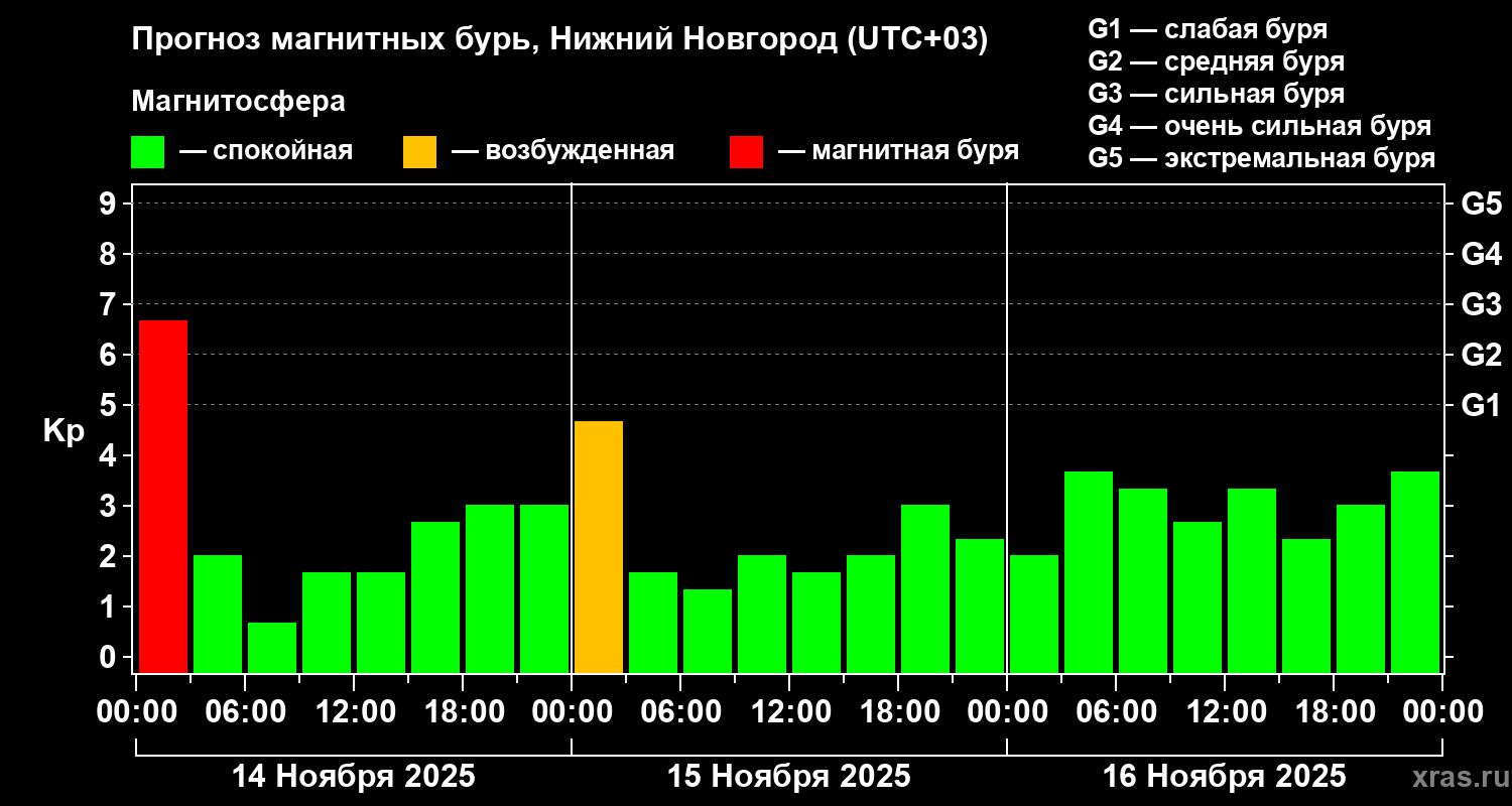 Прогноз магнитных бурь Нижнем Новгороде — 14 ноября 2025 года