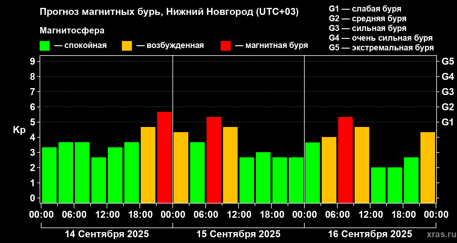 Прогноз магнитных бурь Нижнем Новгороде на 14 сентября 2025 года