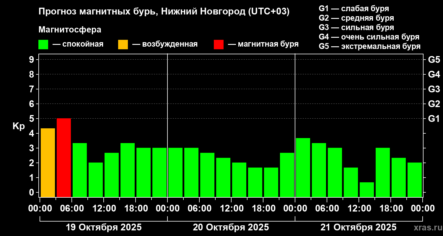 Прогноз магнитных бурь Нижнем Новгороде на 19 октября 2025 года