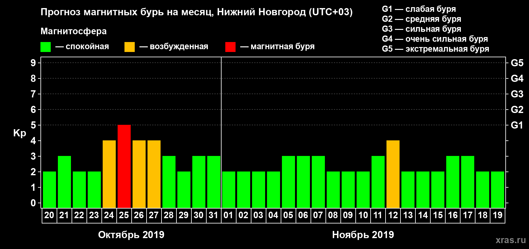 Прогноз максимального суточного геомагнитного индекса Kp на 1 месяц (31 день) с 20 октября по 19 ноября 2019 г
