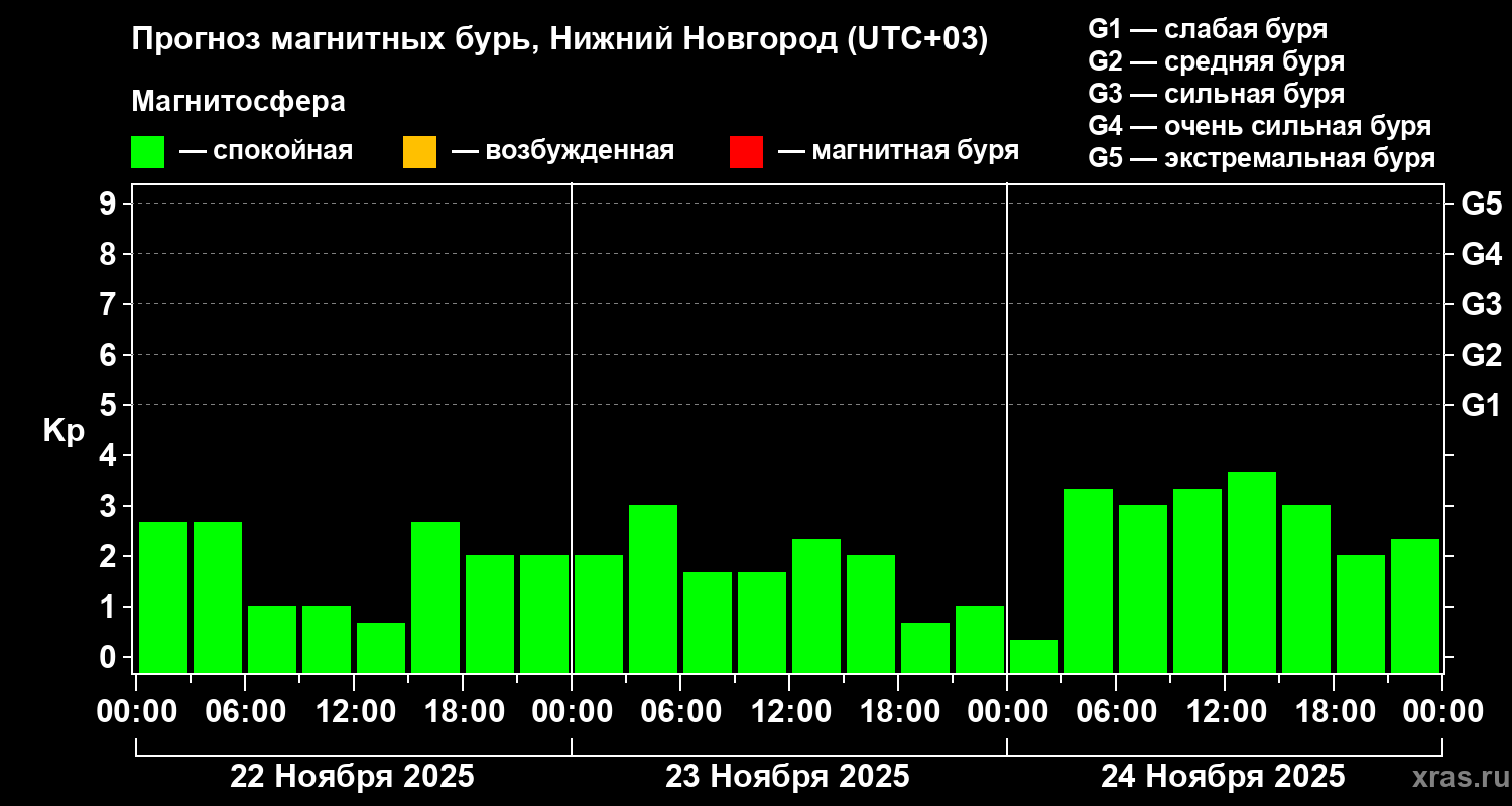 Прогноз магнитных бурь Нижнем Новгороде на 22 ноября 2025 года