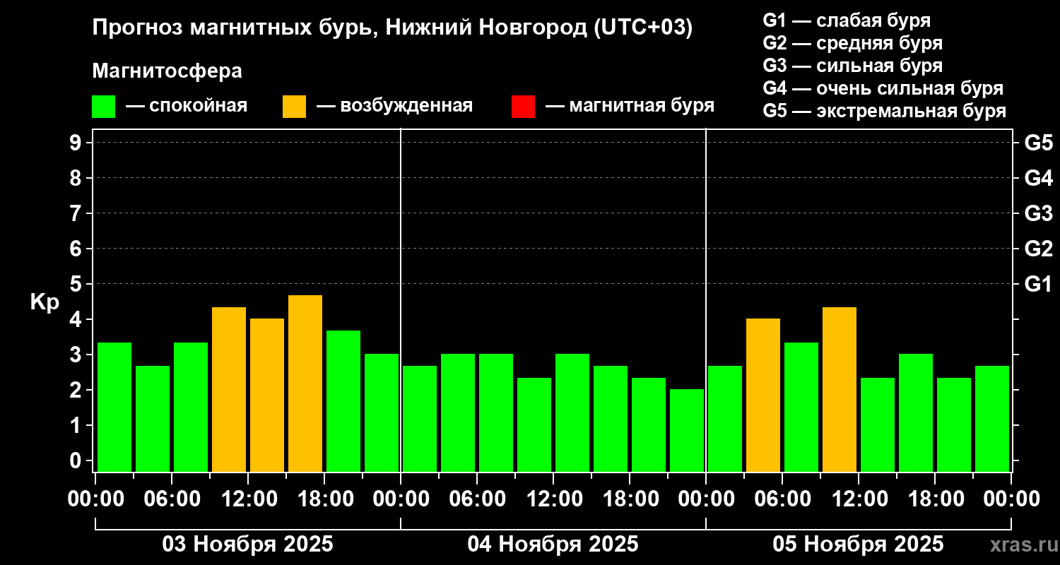 Прогноз магнитных бурь Нижнем Новгороде на 3 ноября 2025 года