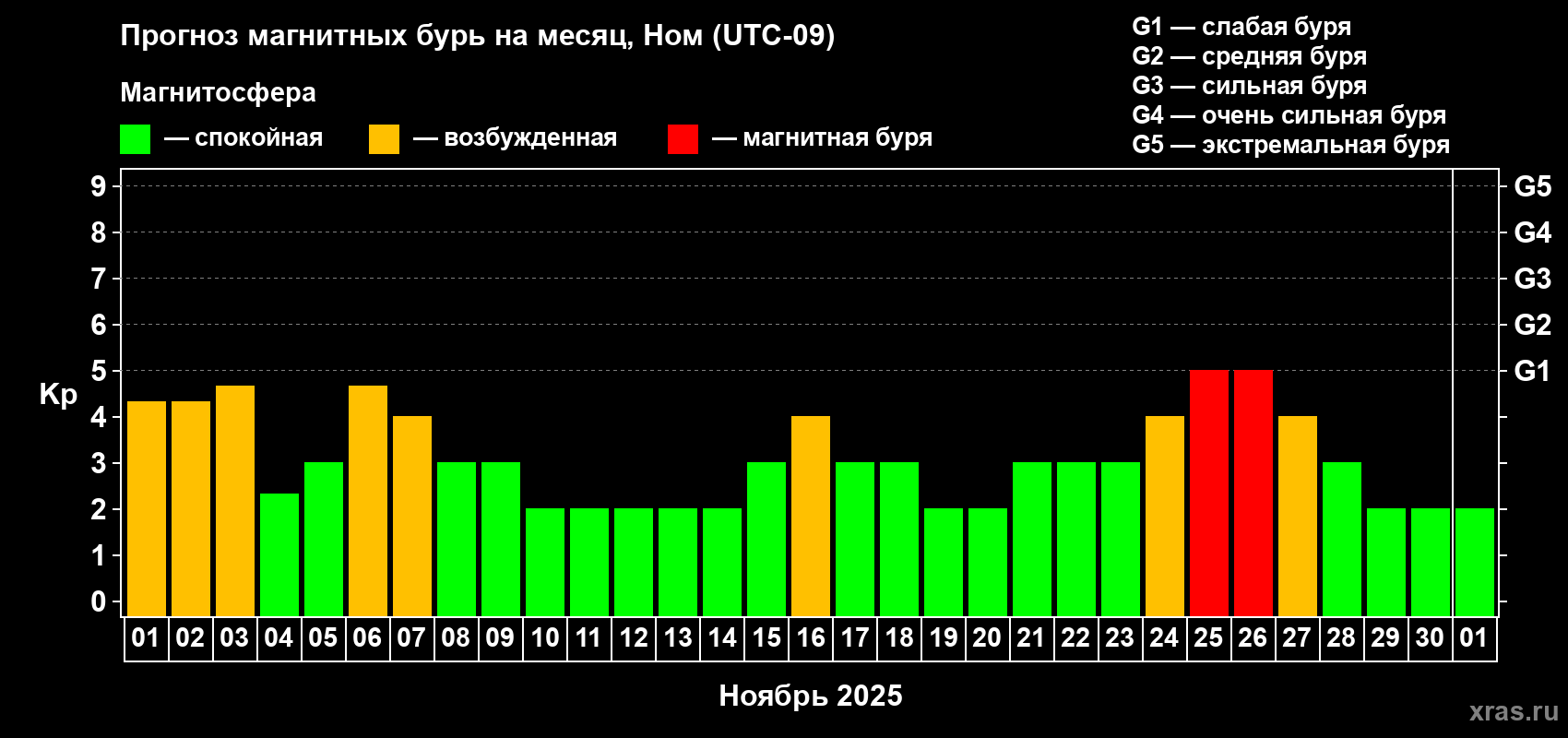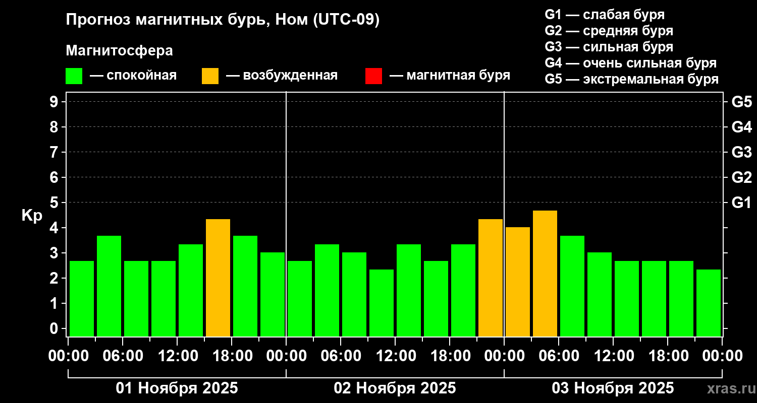 Прогноз магнитных бурь в Номе — 1 ноября 2025 года