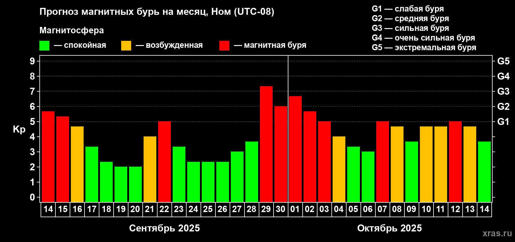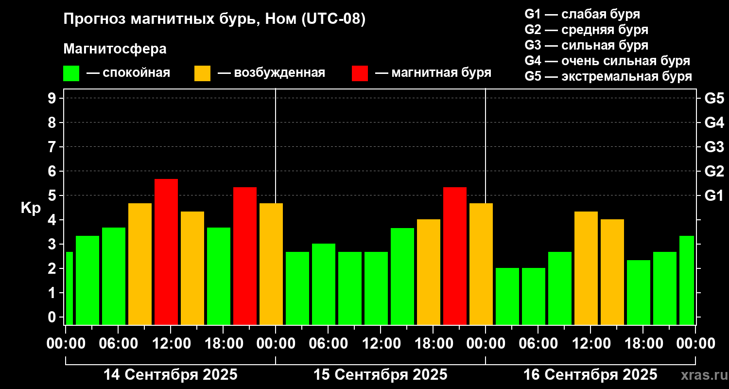 Прогноз магнитных бурь в Номе — 14 сентября 2025 года