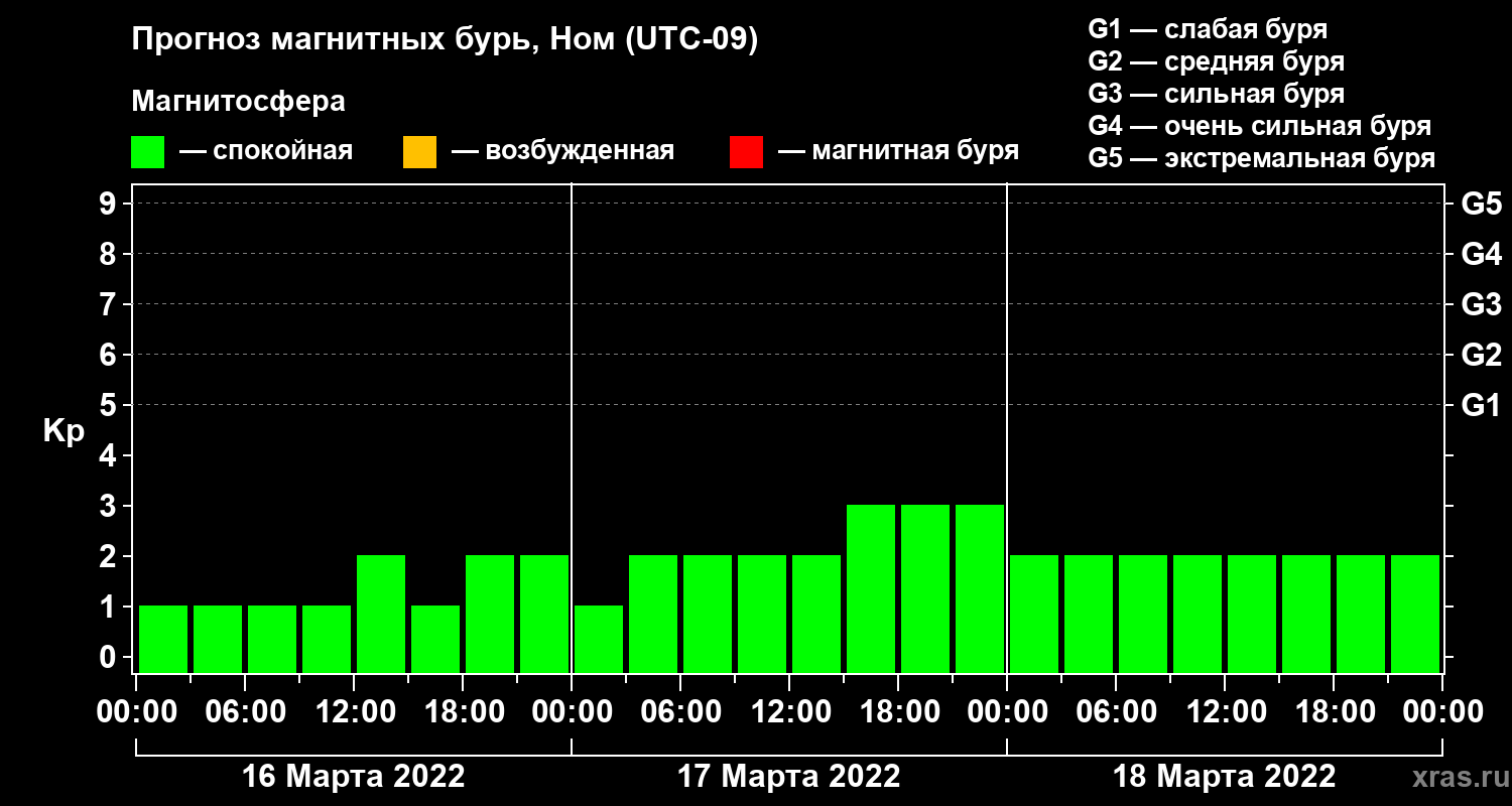Прогноз магнитных бурь в Номе на 16 марта 2022 года