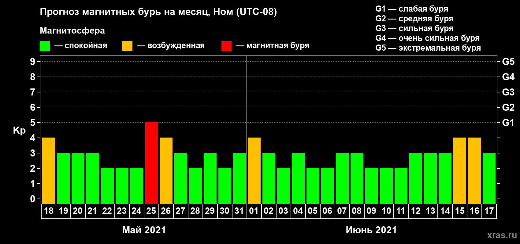 Прогноз магнитных бурь в Номе — 18 мая 2021 года