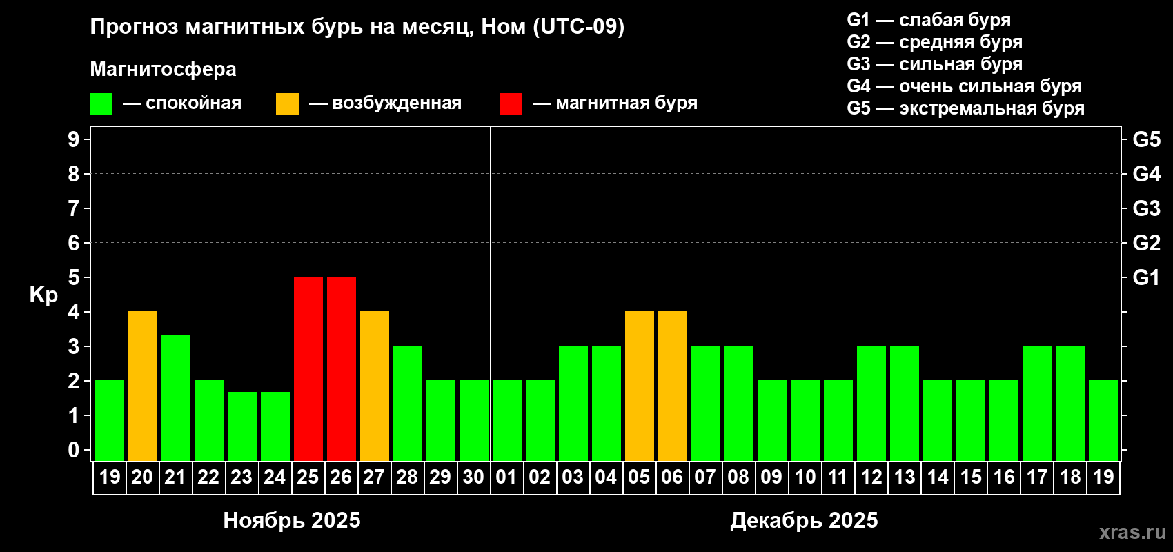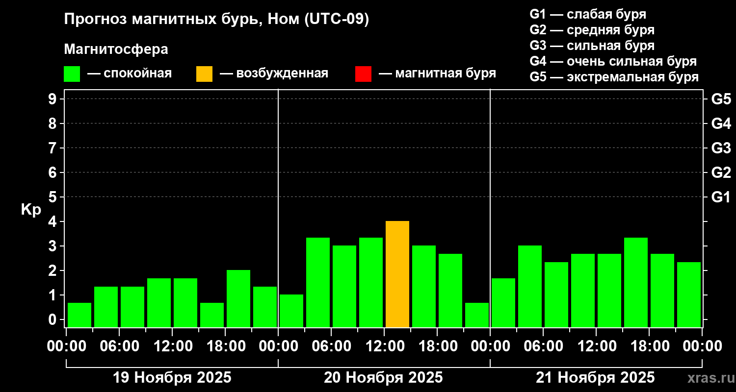 Прогноз магнитных бурь в Номе — 19 ноября 2025 года