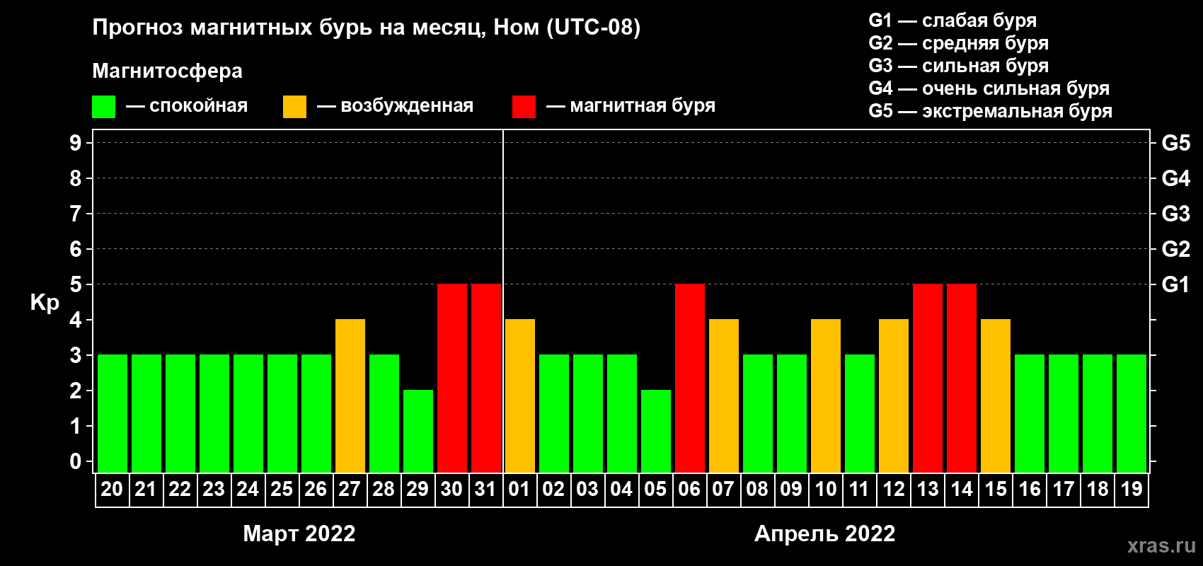 Прогноз магнитных бурь в Номе на 20 марта 2022 года