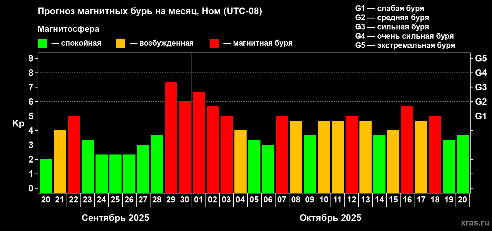 Прогноз магнитных бурь в Номе — 20 сентября 2025 года