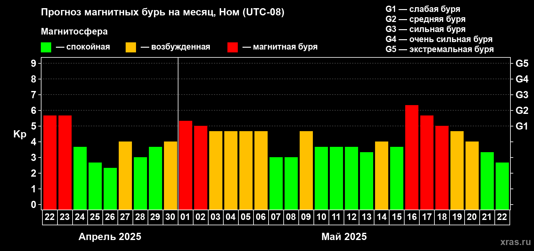 Прогноз магнитных бурь в Номе — 22 апреля 2025 года