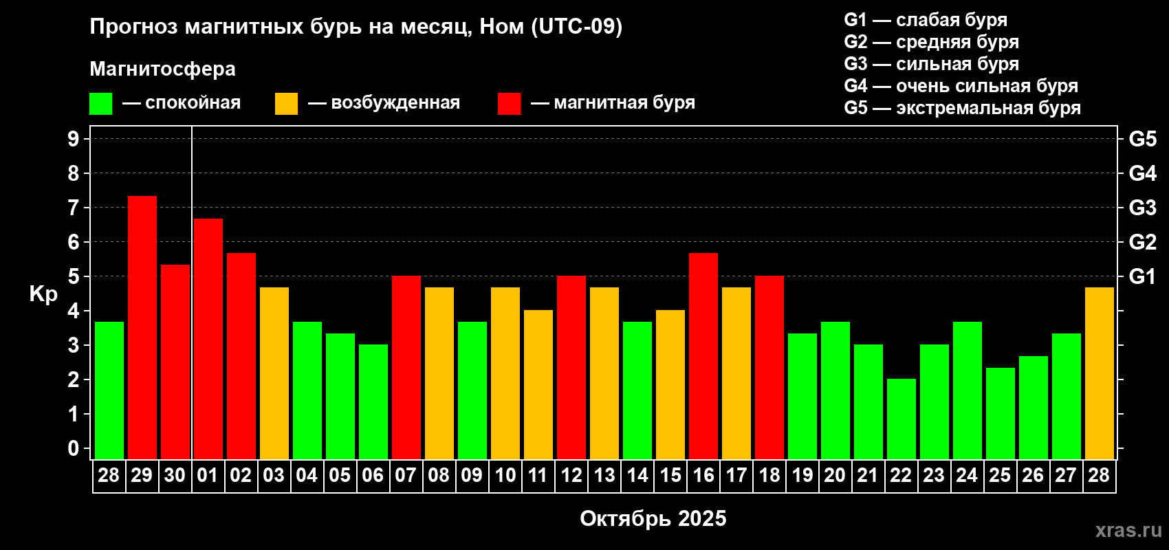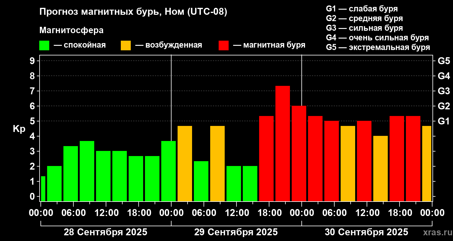 Прогноз магнитных бурь в Номе — 28 сентября 2025 года