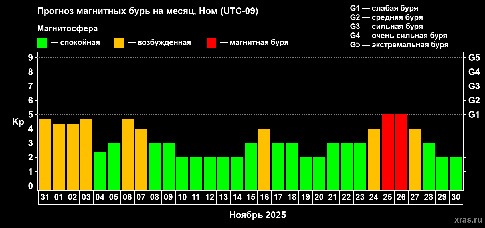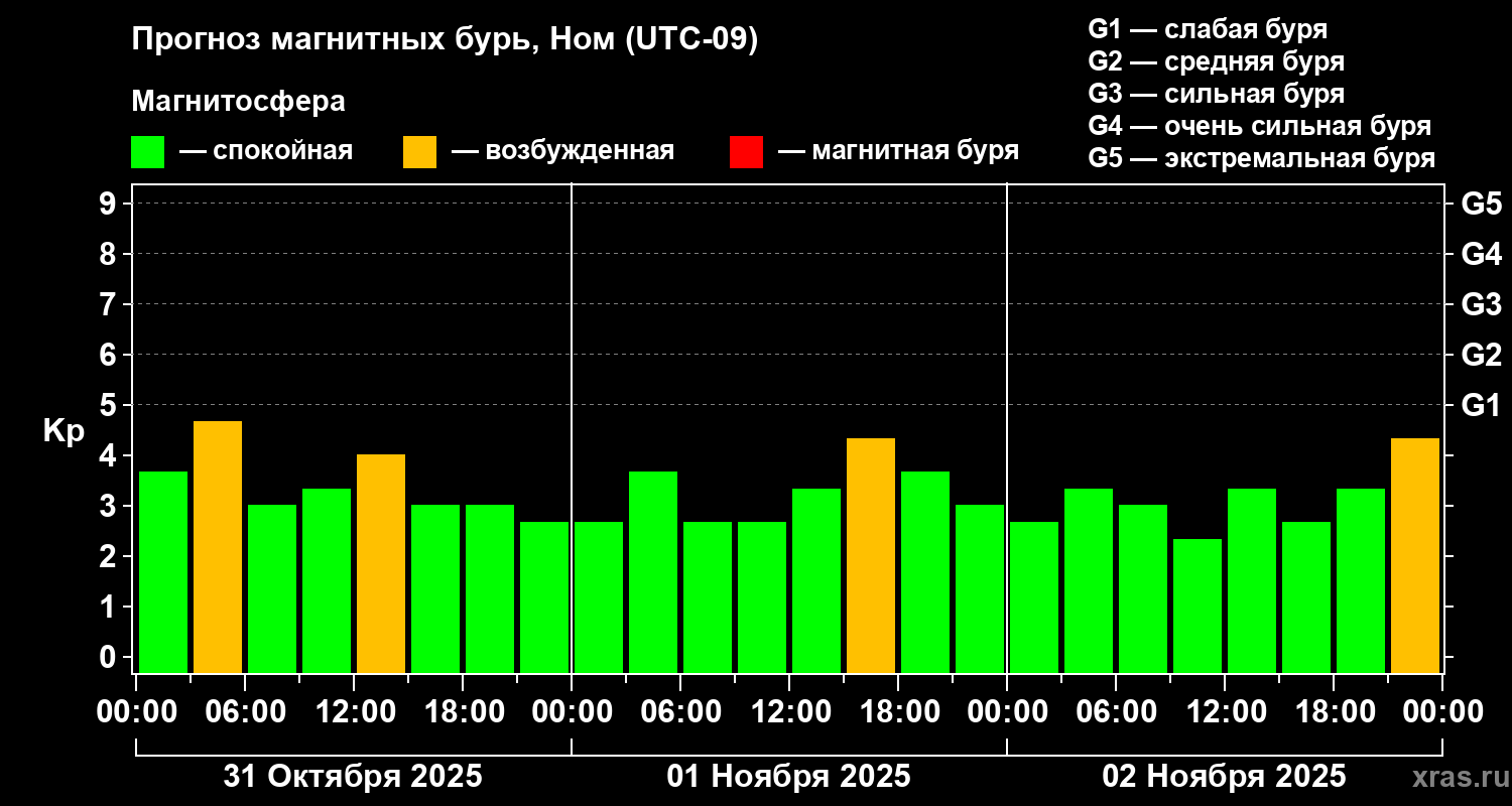 Прогноз магнитных бурь в Номе — 31 октября 2025 года