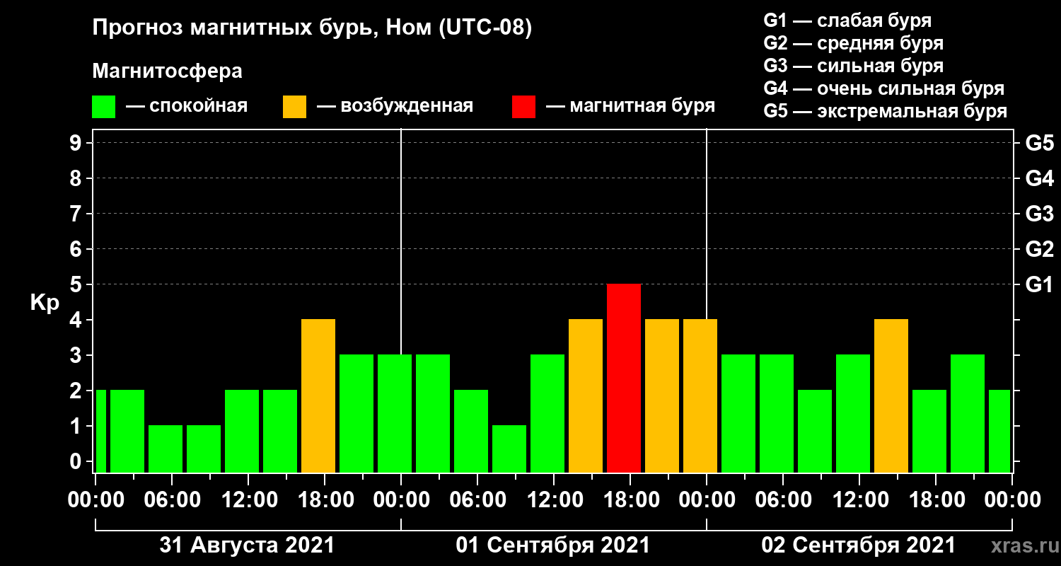 Прогноз магнитных бурь в Номе — 31 августа 2021 года