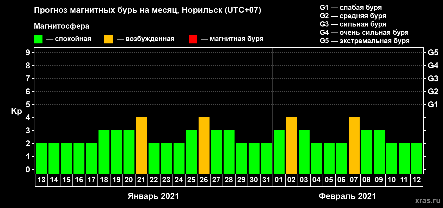 Прогноз магнитных бурь в Норильске — 13 января 2021 года